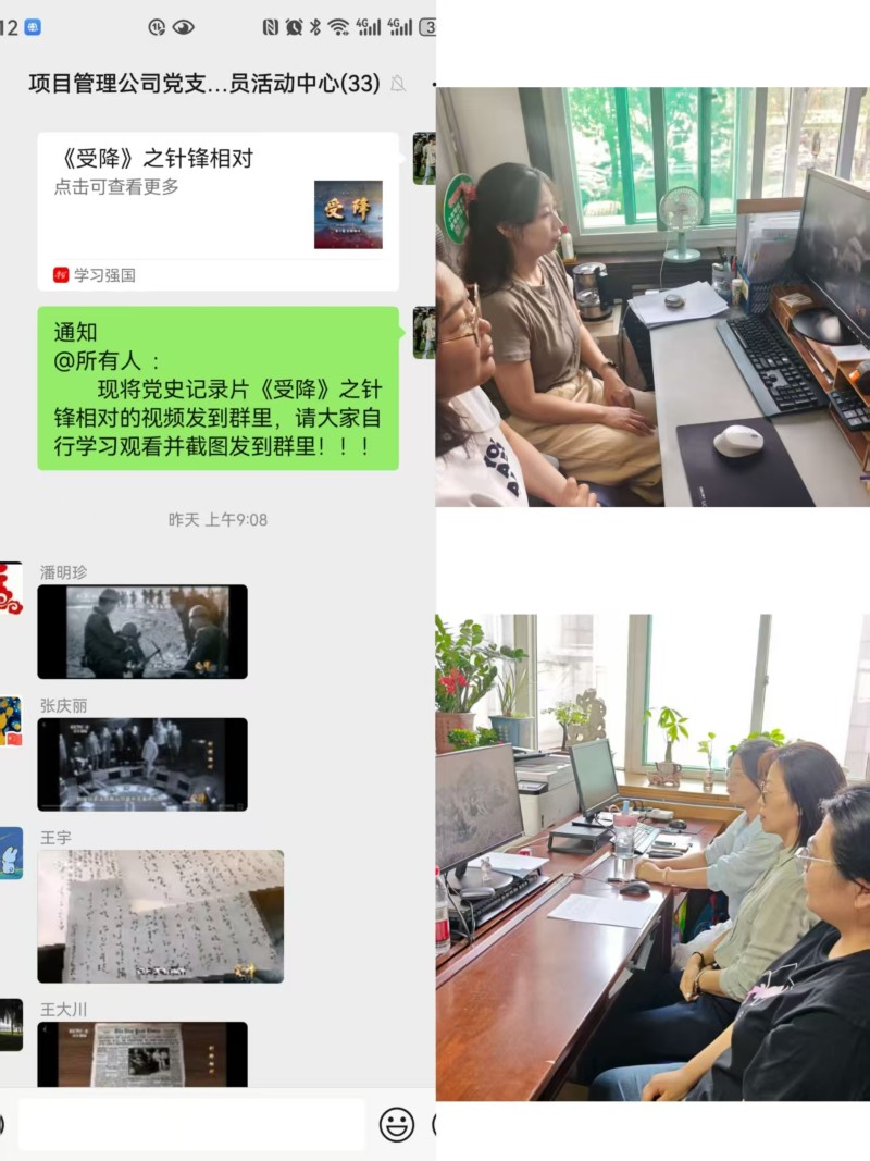 9月1日,項目管理公司黨支部開展“重溫歷史 奮勇爭先”主題活動?;顒又校w黨員干部共同觀看黨史紀(jì)錄片《受降》,紀(jì)錄片以詳實(shí)的史料、珍貴的影像生動展現(xiàn)中國共產(chǎn)黨始終以人民利益為根本,在復(fù)雜形勢下堅守信仰、運(yùn)籌帷幄的政治智慧和使命擔(dān)當(dāng),引導(dǎo)黨員干部不斷加強(qiáng)黨史學(xué)習(xí),切實(shí)把優(yōu)秀歷史經(jīng)驗(yàn)轉(zhuǎn)化為推動工作的實(shí)際行動。