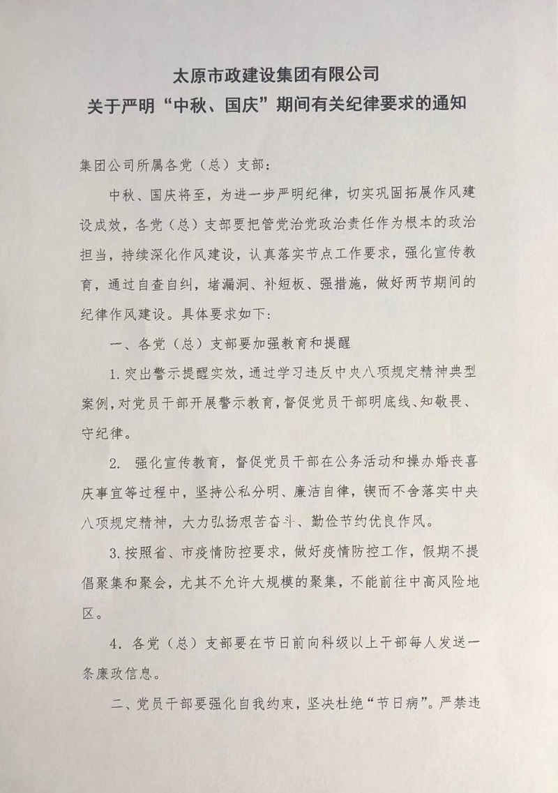 太原市政建設(shè)集團有限公司關(guān)于嚴明“中秋、國慶”期間有關(guān)紀律要求的通知