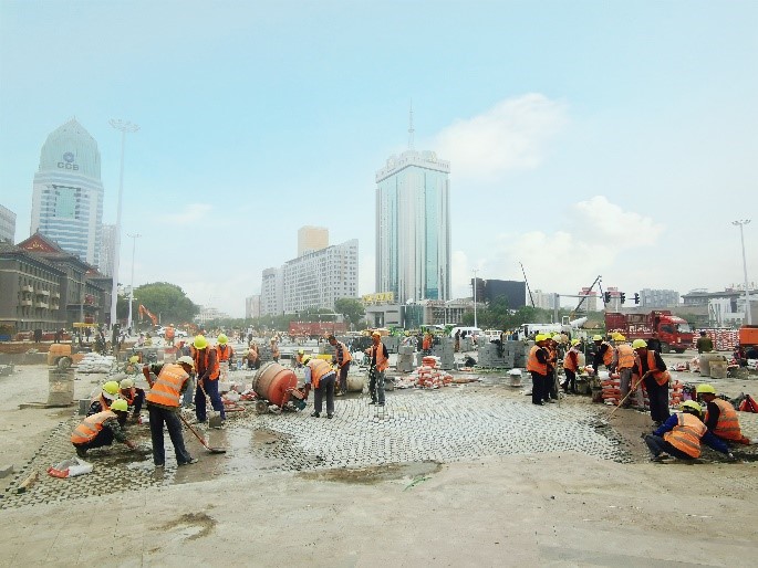 廣場南路段是目前施工最為忙碌的一個路段,花崗巖丁石砌筑、路面清理、廣場綠化、路側(cè)石安裝多道工序同時進(jìn)行。道路一側(cè)工人們正在進(jìn)行花崗巖丁石切割、鋪裝、灌縫、打磨,另一側(cè)路側(cè)石的安裝、砌筑也在同步作業(yè);園林綠化還在進(jìn)行廣場的裝飾;叉車來回穿梭著運送石料、水泥,霧炮車在工地上不停降塵,灑水車正在對路面進(jìn)行清洗,打磨機(jī)正在對花崗巖丁石進(jìn)行打磨,全體施工人員上下一心,24小時奮戰(zhàn)在施工一線,以“鐵軍”的堅定意志,確保工程按期完工。