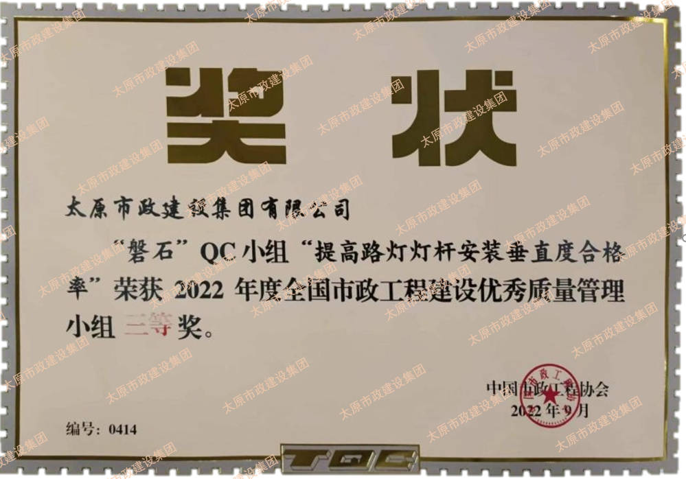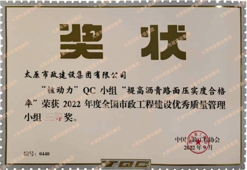 集團(tuán)公司申報的“磐石”QC小組“提高路燈燈桿安裝垂直度合格率”、“核動力”QC小組“提高瀝青路面壓實(shí)度合格率”榮獲2022年度全國市政工程建設(shè)優(yōu)秀質(zhì)量管理小組三等獎。