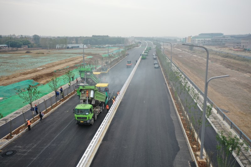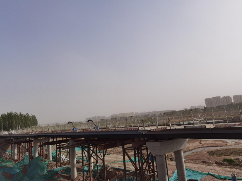 濱河?xùn)|路南延二期工程施工一標(biāo)段北起迎賓路,南至設(shè)計樁號K5+500,道路全長約5.3公里,設(shè)計紅線寬為51.5-60米,施工內(nèi)容包括人行地下通道、排水、電力、下穿通道、高架橋、道路工程,于2021年12月開工建設(shè),由一公司、三公司共同承建。該工程作為市重點項目,一公司強效組織、積極籌劃,確立“精心組織、精準(zhǔn)對標(biāo)、精細管理、精致施工”的理念,采取“分段管理”的施工方案,確立七個工區(qū),并安排專人負責(zé)各工段,形成全面開花、相互協(xié)作的工作局面,大力提高施工效率。施工中,項目部錨定目標(biāo)節(jié)點,制定施工計劃,冬季施工中認真做好混凝土養(yǎng)護和保溫工作,有效防止混凝土凍裂;采用放坡和拉森鋼板樁+鋼支撐的支護方式,嚴格控制鋪筑厚度逐層回填夯實,為施工奠定堅實基礎(chǔ);合理調(diào)配110臺機械、854名施工人員24小時倒班不間斷作業(yè),最快一天連續(xù)鋪筑瀝青混凝土1800米,掀起“大干不停歇”的施工熱潮。2022年9月,一公司圓滿完成全部施工任務(wù),在全線七個標(biāo)段中名列前茅,為汾河?xùn)|岸再填一條平坦大道。三公司全體參建人員與時間賽跑,從各施工區(qū)域土方工程破土動工,到墩柱、橋梁相繼“沖出”地平線,爭時間、搶進度,是該工程第一個完成首聯(lián)箱梁澆筑的標(biāo)段。其中,橋梁工程是整個工程的重中之重,結(jié)合工程自身特點,現(xiàn)澆箱梁采用滿堂紅盤扣式支架法進行施工,大大提高了模板安裝精度和施工質(zhì)量,降低了模板、腳手架的安裝難度;項目部嚴格把控瀝青混凝土鋪設(shè)這最為關(guān)鍵的一步,攤鋪機勻速前進,刮平后立即檢查,及時進行人工充分壓實。項目部肩負光榮使命,齊心協(xié)力戰(zhàn)疫情、斗風(fēng)沙、頂驕陽、冒暴雨,及時排除項目建設(shè)過程中難點、堵點問題,以腳踏實地的努力,保證了一個個節(jié)點目標(biāo)的如期完成,確保施工進程“不歇步”,合力攻堅、全速推進,用敬業(yè)和擔(dān)當(dāng)詮釋了實干精神,彰顯了市政人“闖”的精神,“創(chuàng)”的勁頭。