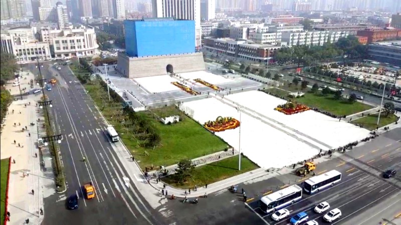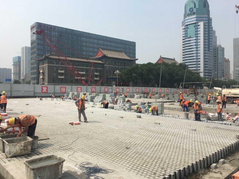 太原市五一廣場改造工程市政道路及管網(wǎng)工程包括環(huán)五一廣場一周的廣場西路、廣場環(huán)路、廣場東路、廣場南路、迎澤南街、并州北路及廣場范圍內(nèi)迎澤大街段道路改造,道路全長1.267公里,于2021年4月開工建設(shè),由二公司負責(zé)承建。該工程經(jīng)歷了近6個月的日夜鏖戰(zhàn),于2021年10月1日圓滿完成了廣場周邊7條道路共35165平方米的道路建設(shè)任務(wù),在集團公司施工史上創(chuàng)造了兩個“第一次”。其中,扇形花崗巖丁石鋪裝在集團公司施工中實屬首次,整個路面是由10厘米×10厘米×30厘米的花崗巖丁石鋪設(shè)而成。整個路面鋪筑由扇形面和方形面組成,整個工程扇形鋪裝面積達到19382平方米,而一個扇形面需要88塊花崗巖丁石,且其中有18塊需要進行切割,一個扇形面鋪裝需要經(jīng)過測量放樣、丁石試拼、切割等十幾道工序,且在花崗巖丁石下側(cè)采用了總厚度達0.98米的道路結(jié)構(gòu)層,極大程度上確保了鋪裝結(jié)構(gòu)的穩(wěn)定性和平整性。同時,為確保工程順利完工,項目部投入大量的人力資源,并優(yōu)先選用工作細致、水平較高、技術(shù)熟練的施工隊伍,確保項目鋪裝進度和質(zhì)量。項目部每天在1.1萬平方米的施工場地上投入250余名民建隊員進行花崗巖丁石鋪裝,同時每個隊伍按照放線-切割-安裝-灌漿-打磨的施工細節(jié),實行“小團隊—流水線”作業(yè),確保了扇形面積的鋪裝進度和質(zhì)量。在當(dāng)時工程即將完工之際,二公司更是從各項目部抽調(diào)技術(shù)骨干和民建隊員,全部投入到廣場最后沖刺,最終實現(xiàn)了五一廣場周邊道路的順利通車。