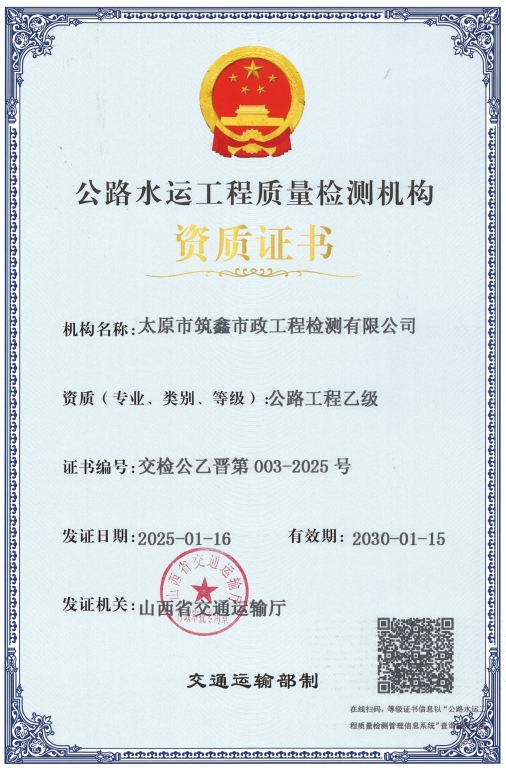 近日,筑鑫公司成功獲得公路水運(yùn)工程質(zhì)量檢測(cè)機(jī)構(gòu)“公路工程乙級(jí)”資質(zhì)證書(shū)。此次資質(zhì)升級(jí),不僅是對(duì)筑鑫公司在公路工程檢測(cè)領(lǐng)域?qū)I(yè)實(shí)力的有力證明,更是其實(shí)現(xiàn)跨領(lǐng)域發(fā)展的重要里程碑,意味著下一步能夠?yàn)楣饭こ探ㄔO(shè)提供更多維度、更具專(zhuān)業(yè)性與精準(zhǔn)度的檢測(cè)服務(wù)。