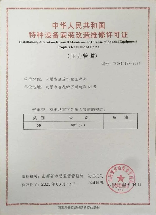 3月14日,通途市政工程處喜獲山西省市場監(jiān)督管理局頒發(fā)的中華人民共和國特種設(shè)備安裝改造維修許可證,獲準(zhǔn)從事GB2(2)壓力管道的安裝。這是通途市政工程處在資質(zhì)業(yè)務(wù)上的又一重大突破,開辟了經(jīng)營范圍的新領(lǐng)域,為企業(yè)今后的多元化發(fā)展奠定了良好基礎(chǔ)。