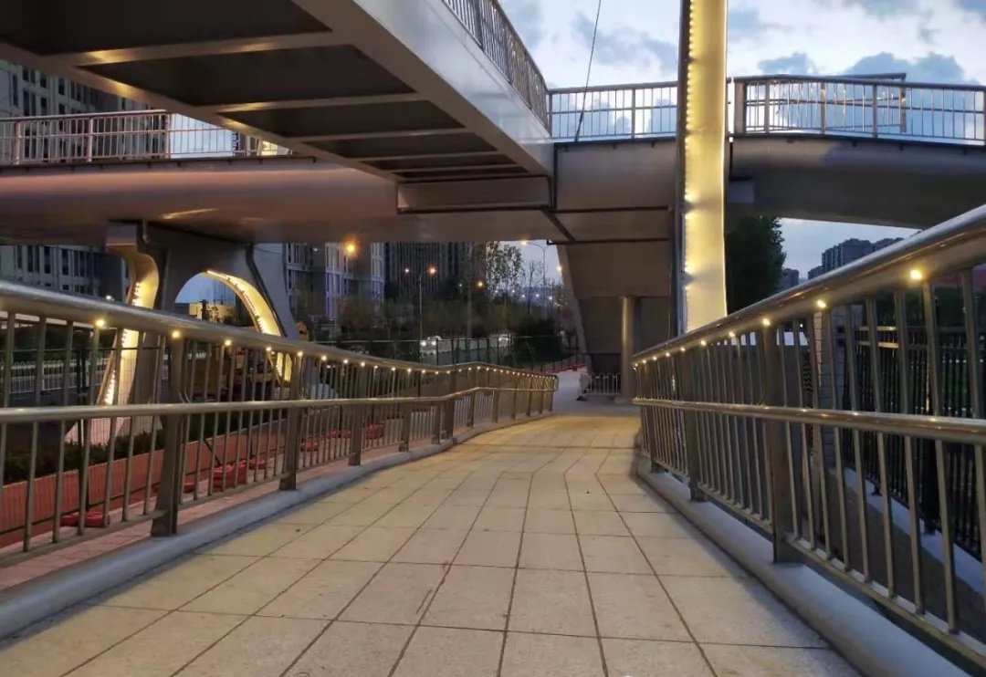 該工程為橋梁結(jié)構(gòu),采用連續(xù)梁加塔索裝飾鋼板梁,需在主橋兩側(cè)設(shè)梯道和無障礙坡道欄桿扶手內(nèi)設(shè)置LED點(diǎn)光源,并在塔凹槽內(nèi)近機(jī)動車道處安裝條形LED洗墻燈。