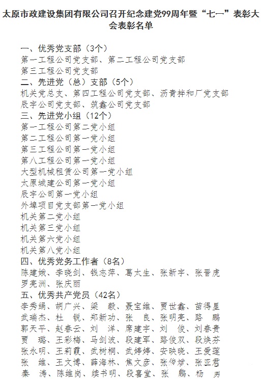 會(huì)上,黨委副書記、董事閆水平宣讀了集團(tuán)公司《紀(jì)念建黨99周年暨創(chuàng)先爭(zhēng)優(yōu)活動(dòng)表彰決定》,大會(huì)對(duì)3個(gè)優(yōu)秀黨支部、5個(gè)先進(jìn)黨支部、12個(gè)先進(jìn)黨小組、8名優(yōu)秀黨務(wù)工作者、42名優(yōu)秀共產(chǎn)黨員進(jìn)行了表彰。2019年,集團(tuán)公司黨委在市委住建工委的正確領(lǐng)導(dǎo)下,以“為職工拼幸福、為企業(yè)謀發(fā)展”為目標(biāo),強(qiáng)定力、激活力、挖潛力、增動(dòng)力、提能力、聚合力,“六力”齊發(fā),使基層黨組織“強(qiáng)硬”有威信,黨員干部“共振”有活力。