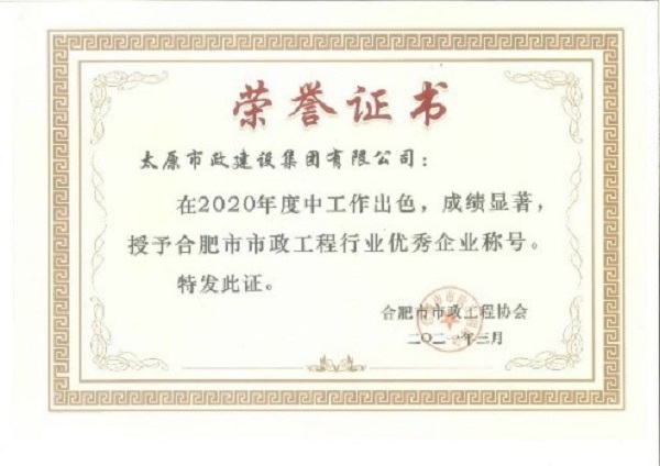 3月,集團(tuán)公司榮獲合肥市市政工程協(xié)會頒發(fā)的2020年度“合肥市市政工程行業(yè)優(yōu)秀企業(yè)”榮譽(yù)稱號。張晉虎、王東根榮獲2020年度“合肥市市政工程行業(yè)優(yōu)秀項(xiàng)目經(jīng)理”榮譽(yù)稱號。