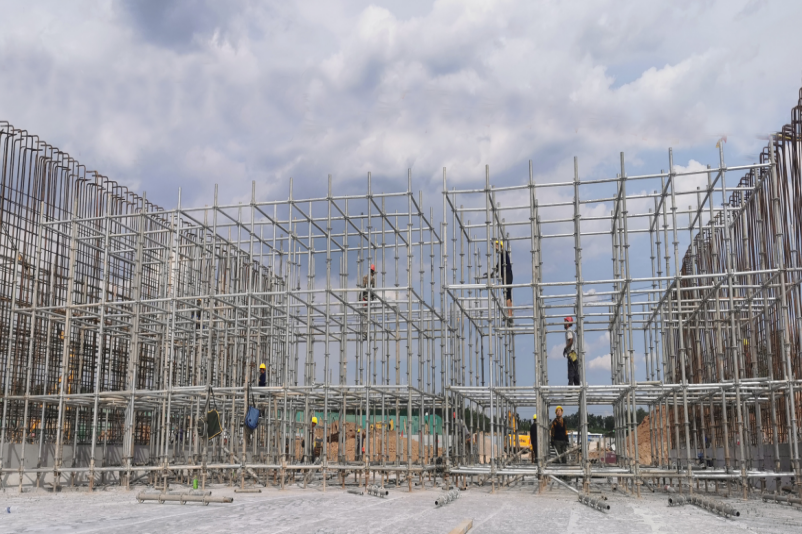 支架搭設提質(zhì)量 該工程在由東向西下穿東山過境高速公路的施工中,設計有1座長65米、寬33米、高8米,單孔跨徑為18米的四孔通道箱涵。依據(jù)國家相關規(guī)定,該通道施工屬于超過一定規(guī)模且危險性較大的分部分項工程,需要組織專家對施工方案進行論證。項目部提前謀劃,開工伊始責成相關技術人員制定專項方案,在六月中旬順利通過了專家論證,為后續(xù)施工奠定了堅實基礎。針對該通道墻板厚、荷載大、支模架搭設跨度寬的情況,項目部按照規(guī)定要求,決定采用組裝快捷、使用方便、節(jié)省費用、安全性達標的盤扣式鋼管支架進行打設,確保高支?;炷翝仓踩€(wěn)定,有效保證了頂板支架搭設的施工安全。