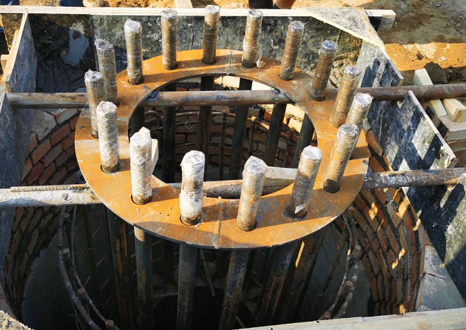 十三項目部承建的桃園四巷片區(qū)道路改造工程地處老城區(qū),地下水位高,基礎(chǔ)埋深較深,土質(zhì)為淤泥質(zhì)軟土,且道路兩側(cè)分布高壓電桿。施工中,項目部不斷創(chuàng)新施工工藝,改進施工技術(shù),為工程的順利完工奠定了堅實的基礎(chǔ)。為配合市政府進行無纜化社區(qū)改造施工,需在新建路桃園四巷路口打設(shè)一處電纜鋼桿基礎(chǔ),該鋼桿基礎(chǔ)為直徑1.8米,埋深5.7米的鋼筋混凝土結(jié)構(gòu)。由于緊鄰高壓電桿,無法采用常見的基坑施工方法,經(jīng)過技術(shù)人員討論分析,項目部決定采用沉管工藝進行施工。施工中,需在基礎(chǔ)位置挖設(shè)外徑2.5米、深度1米的基坑內(nèi)垂直放置內(nèi)徑1.5米,長度2.5米的企口混凝土管,項目部采用機械配合人工挖土的方式進行管道下沉施工。為加快施工進度,施工人員采用三班交替24小時不間斷施工的方法,經(jīng)過3天4夜的日夜奮戰(zhàn),順利將2根2.5米長的預(yù)制混凝土管沉入指定深度。隨后,通過安插片石穩(wěn)定管基,澆筑混凝土進行沉管封底,待基坑底部混凝土達到規(guī)定強度后,按設(shè)計高程吊裝并固定鋼筋籠,最終圓滿完成了鋼桿基礎(chǔ)的施工任務(wù),為工程質(zhì)量和施工安全提供了有效保障。