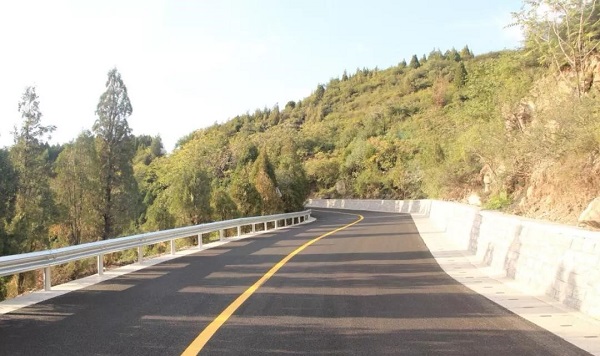 由于施工路段全部為山路,材料的運(yùn)輸、攤鋪困難。在水穩(wěn)攤鋪時(shí),材料和機(jī)械無法一次性到位,需要二次上料,二次倒料,運(yùn)輸車先將瀝青混合料倒在指定地點(diǎn),再用小型鏟車將混合料裝到攤鋪機(jī)上。攤鋪過程中,山路坡度較大,靜態(tài)壓路機(jī)無法進(jìn)行作業(yè),只能先采用振動(dòng)壓路機(jī)碾壓,再用雙鋼輪壓路機(jī)進(jìn)行二次碾壓,保證水穩(wěn)面層壓實(shí)度符合規(guī)范要求。針對(duì)坡陡、彎急的山路特點(diǎn),項(xiàng)目部在施工建設(shè)中不僅對(duì)轉(zhuǎn)彎處路面進(jìn)行了加寬,還對(duì)路面外側(cè)進(jìn)行加高,使路面向山體一側(cè)傾斜,提高了行車安全和舒適度。此外,由于西山山體土質(zhì)疏松,項(xiàng)目部還在道路臨溝地段,建設(shè)下嵌式路肩擋土墻,擋土墻下嵌在地下60厘米到70厘米,有效防止路基邊坡平移、側(cè)滑。