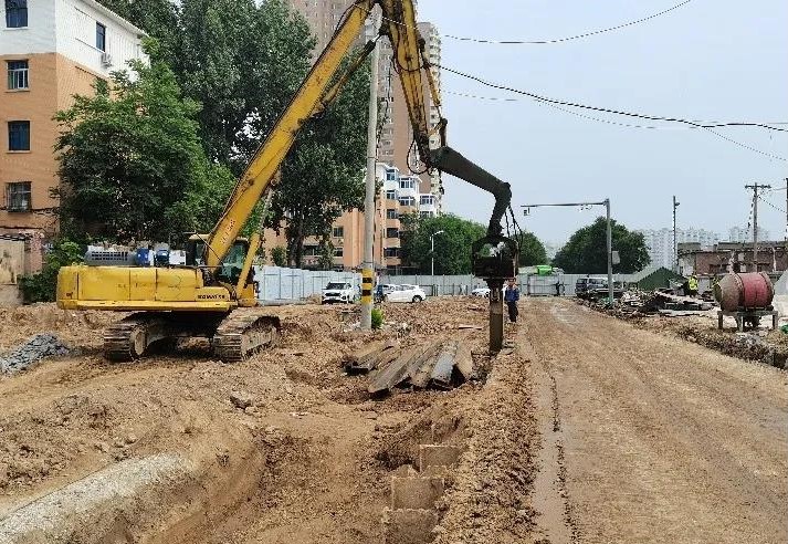 除迎新街北段外,其他道路在溝槽開挖時,都需要在施工過程中對老舊居民樓進行保護。項目部經(jīng)過仔細(xì)研究后,決定在建筑物旁采用兩排高壓旋噴樁進行隔離保護,減少施工對老舊建筑物的影響,確保工程安全。面對地下管線復(fù)雜的情況,項目部積極聯(lián)系業(yè)主,多次與煤氣、自來水、供熱等公司溝通協(xié)調(diào),最終對影響施工的管線進行改遷,為工程順利施工奠定了基礎(chǔ)。同時,迎新西一條施工范圍內(nèi)有十余根高壓電線桿,緊鄰雨污水管,因電線桿短期內(nèi)無法遷移,若進行溝槽開挖,存在極大安全隱患,為確保施工安全,項目部采用打鋼板樁的方式對電線桿進行保護,順利解決了施工難題。