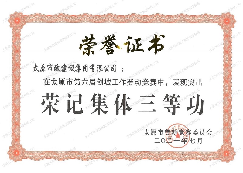太原市第六屆創(chuàng)城工作勞動(dòng)競(jìng)賽集體三等功榮譽(yù)證書